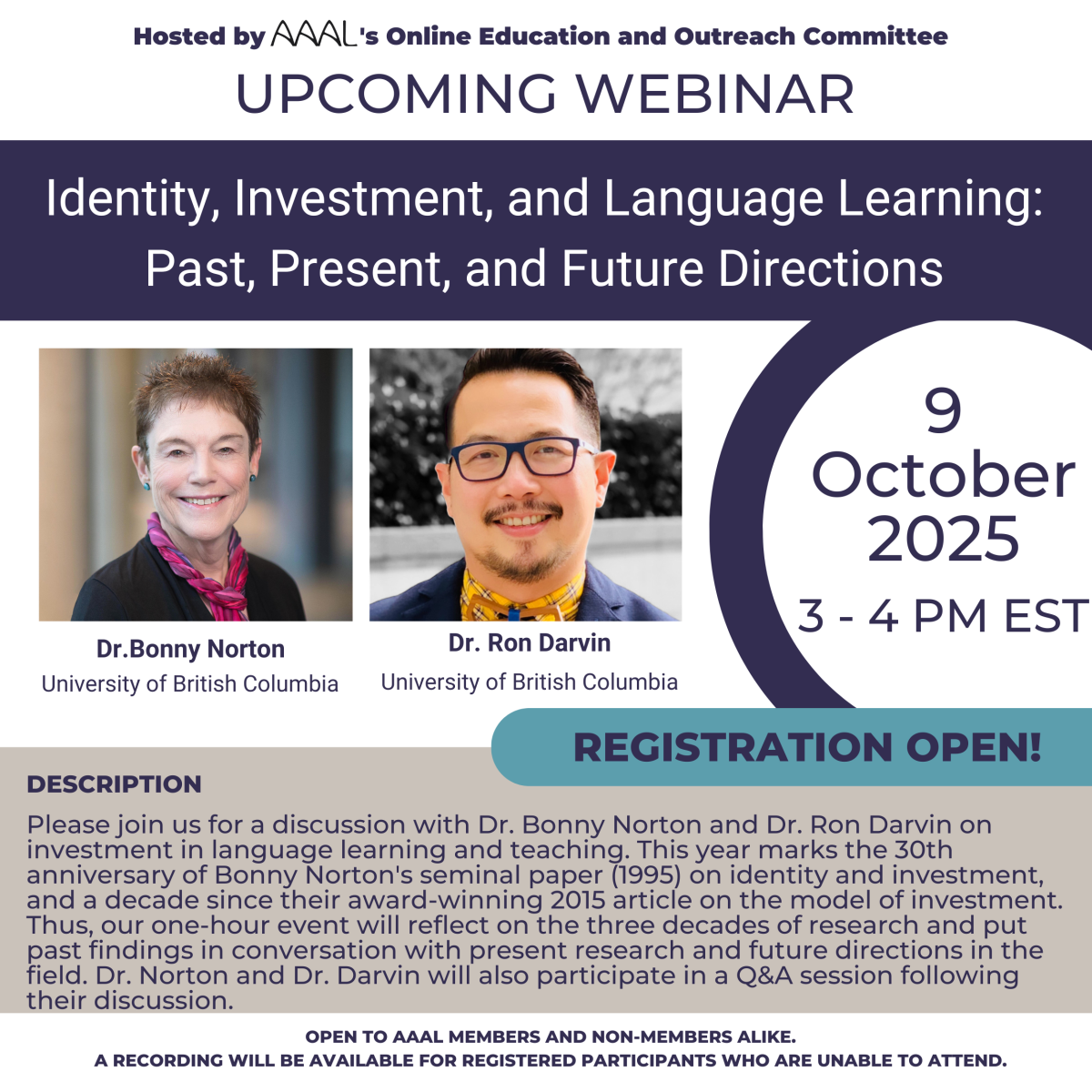 Please join us for a discussion with Dr. Bonny Norton and Dr. Ron Darvin on investment in language learning and teaching. This year marks the 30th anniversary of Bonny Norton's seminal paper (1995) on identity and investment, and a decade since their award-winning 2015 article on the model of investment. Thus our one-hour event will reflect on the three decades of research and put past findings in conversation with present research and future directions in the field. Dr. Norton and Dr. Darvin will also participate in a Q&A session following their discussion.
