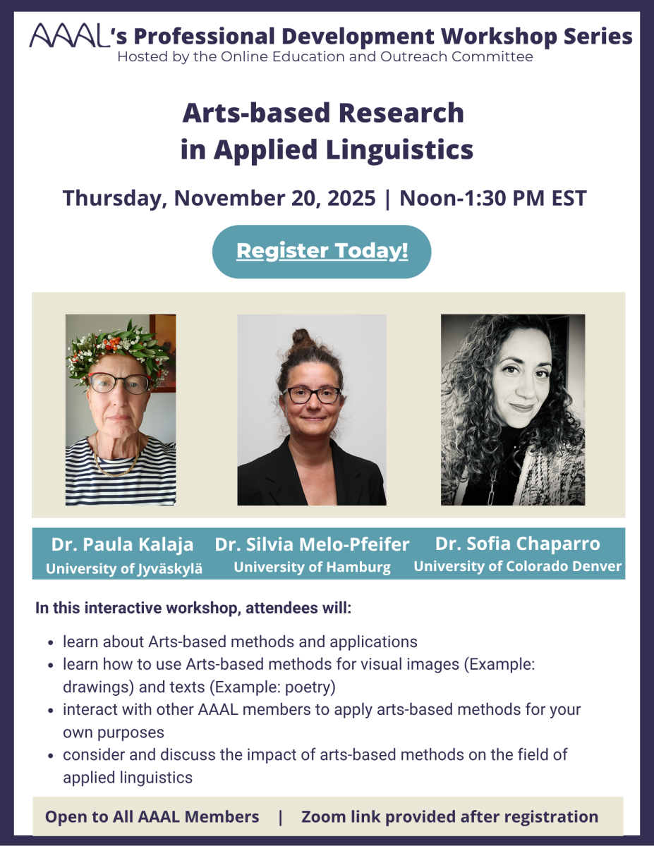 The 2025 Fall Workshop will provide information and some hands-on experience with arts-based research for applied linguistics. This field is growing quickly; several sessions were held at the 2025 AAAL Conference, and this Workshop will explore the field and its practical implications further.