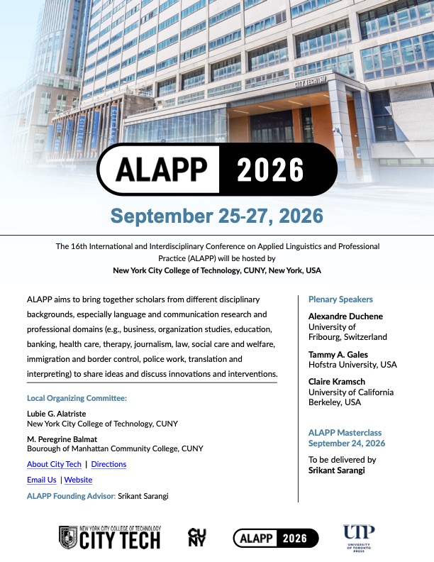 Call for Proposals: The 16th International and Interdisciplinary Conference on Applied Linguistics and Professional Practice (ALAPP)